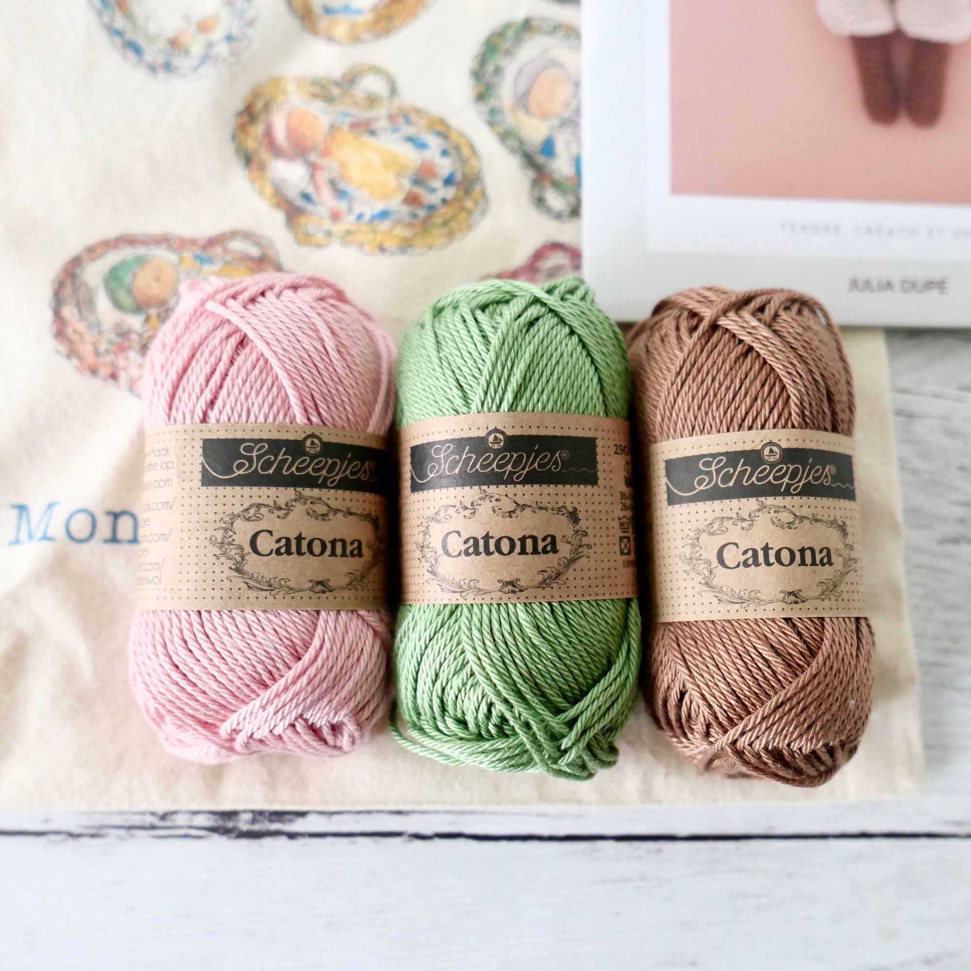 - 3 pelotes de fil : 1 pelote de Catona Scheepjes 25 g coloris Noisette; 1 pelote de Catona Scheepjes 25 g coloris Lin et 1 pelote de Catona Scheepjes 25 g coloris Jaune Safran.